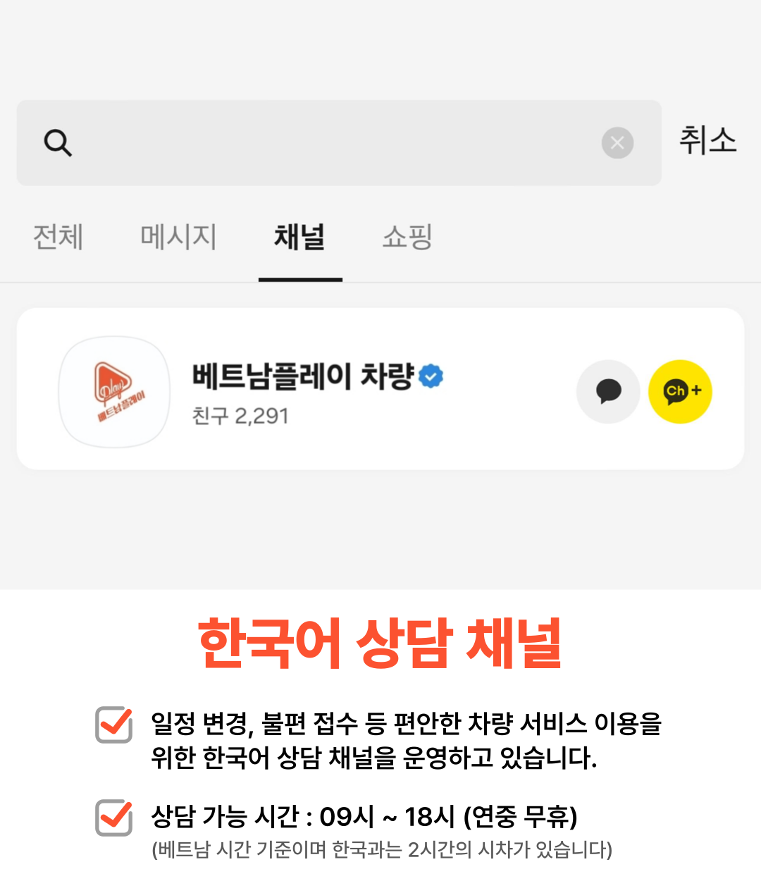 카카오 채널 "베트남플레이 차량" 으로 연락주시면