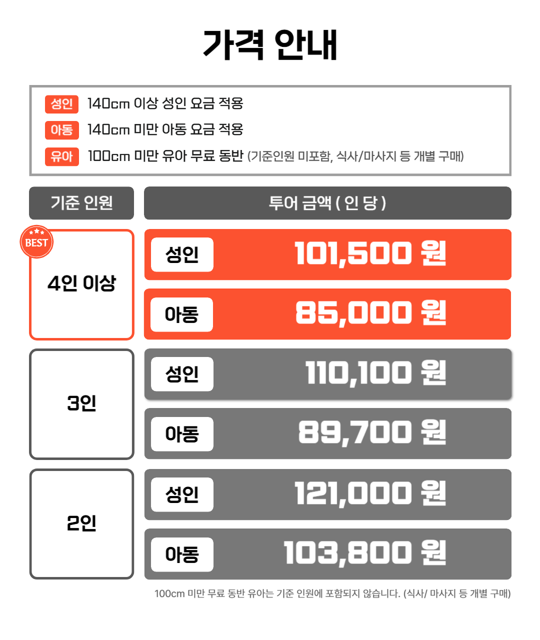 - 유아 : 키 100cm 미만 아동 무료 동반