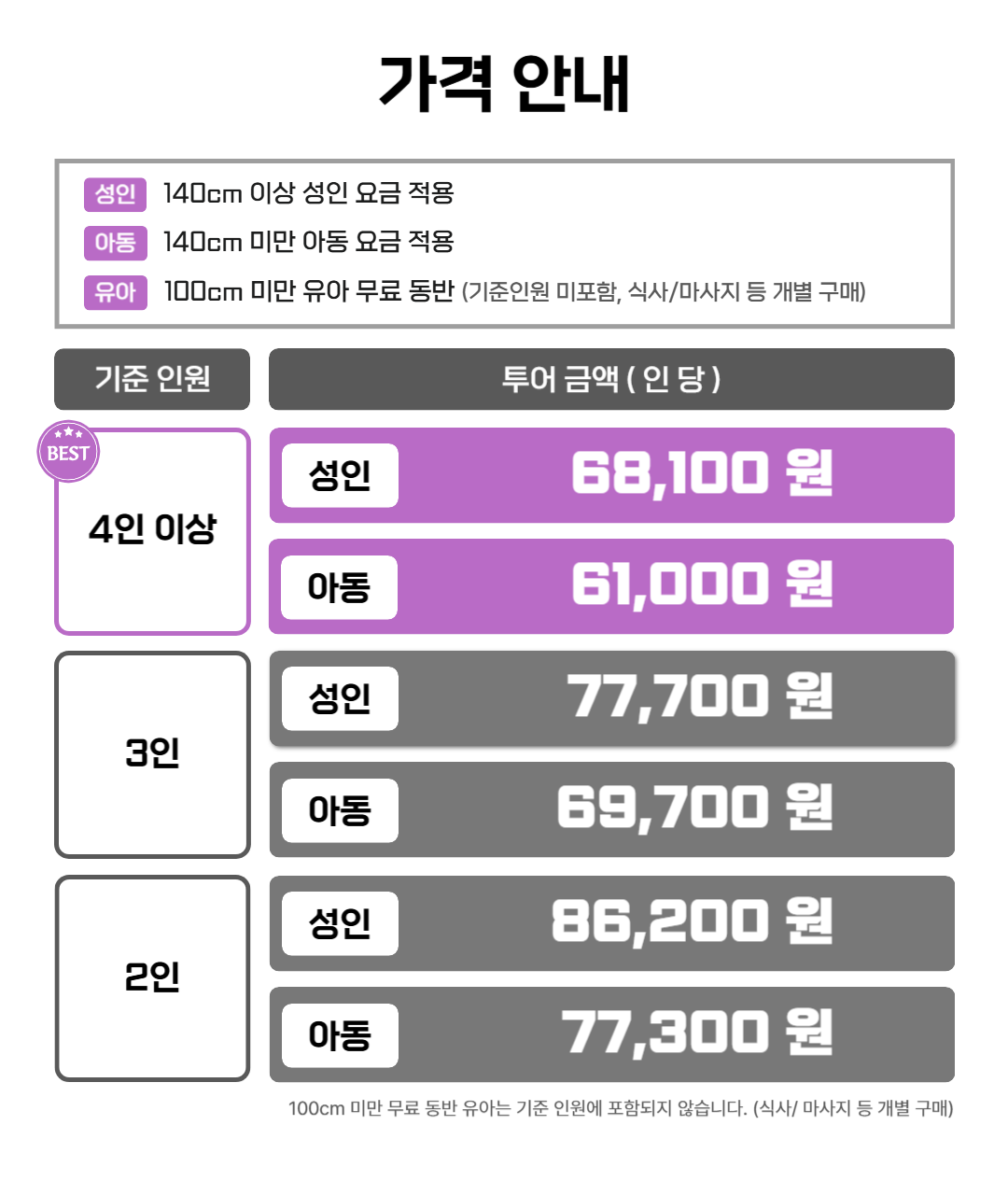 - 유아 : 키 100cm 미만 아동 무료 동반