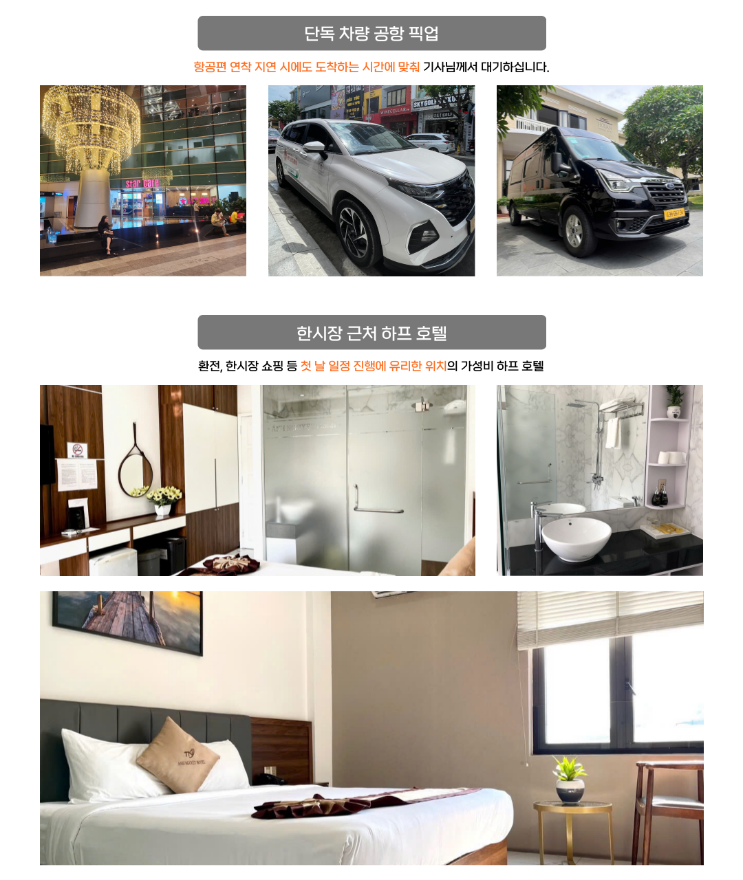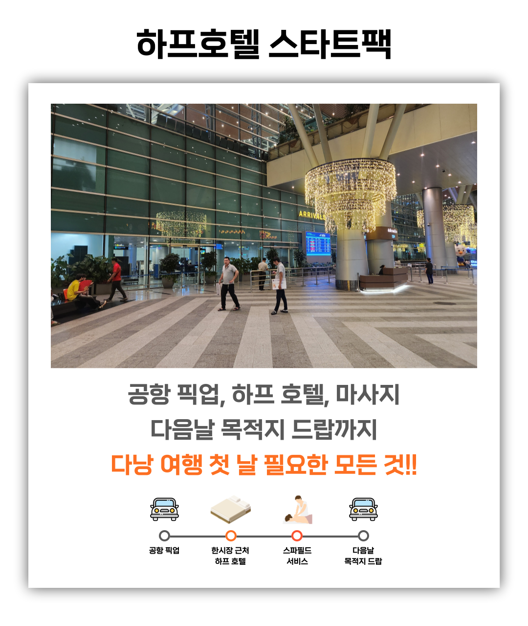 공항 픽업, 한시장 근처 하프 호텔, 마사지(옵션), 다음날 목적지 샌딩까지