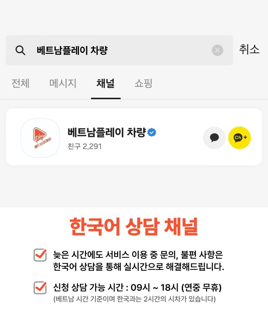 카카오 채널 "베트남플레이 차량" 으로 연락주시면