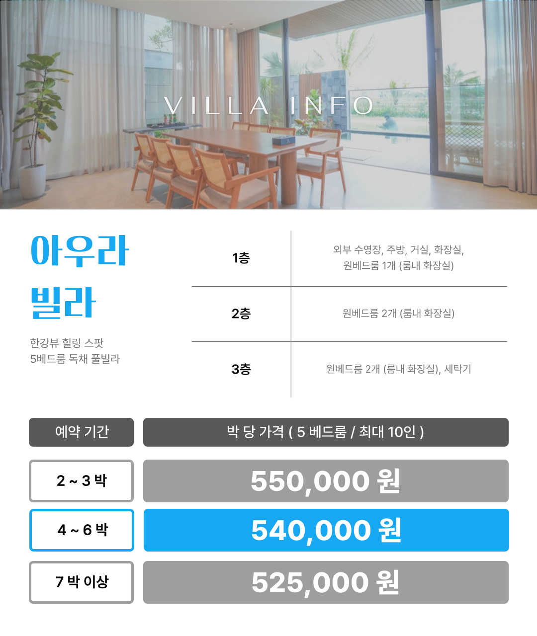 • 빌라 측 사정으로 인해 빌라 요금에 다소 차이가 발생하거나 예약이 불가능할 수도 있습니다.