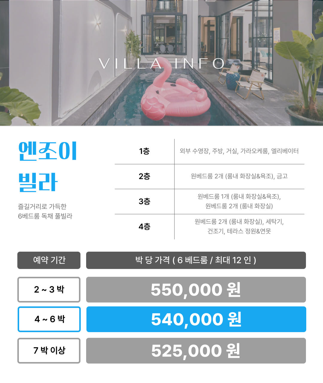 • 빌라 측 사정으로 인해 빌라 요금에 다소 차이가 발생하거나 예약이 불가능할 수도 있습니다.