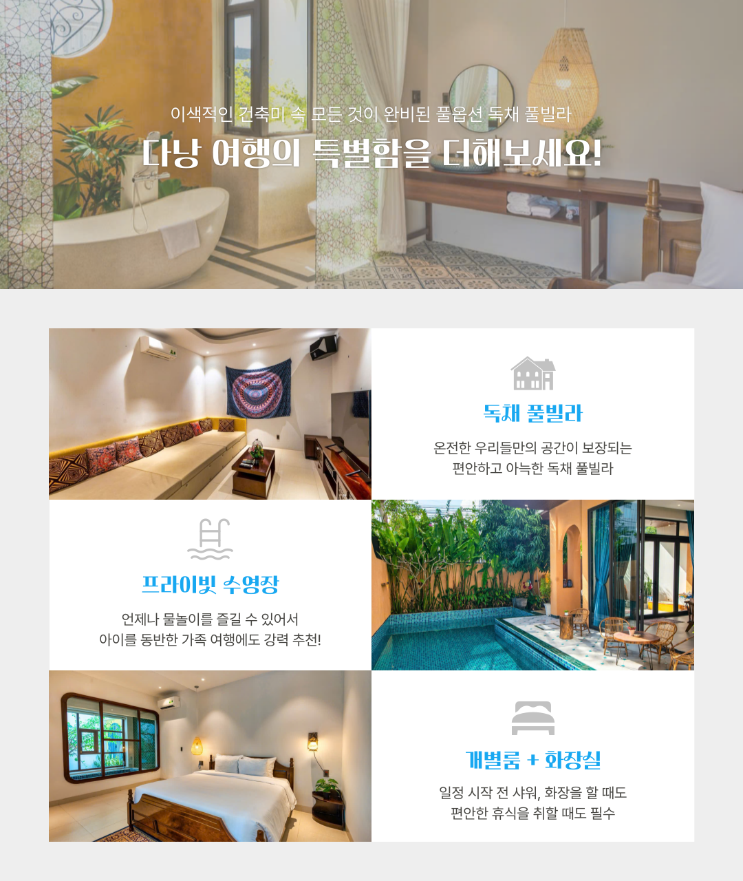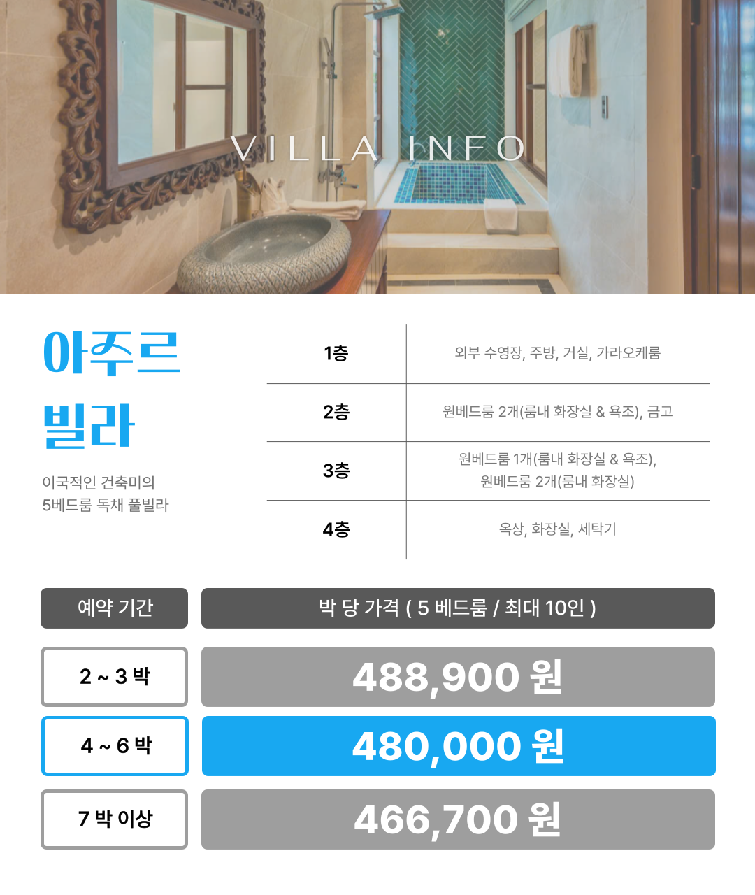 • 빌라 측 사정으로 인해 빌라 요금에 다소 차이가 발생하거나 예약이 불가능할 수도 있습니다.