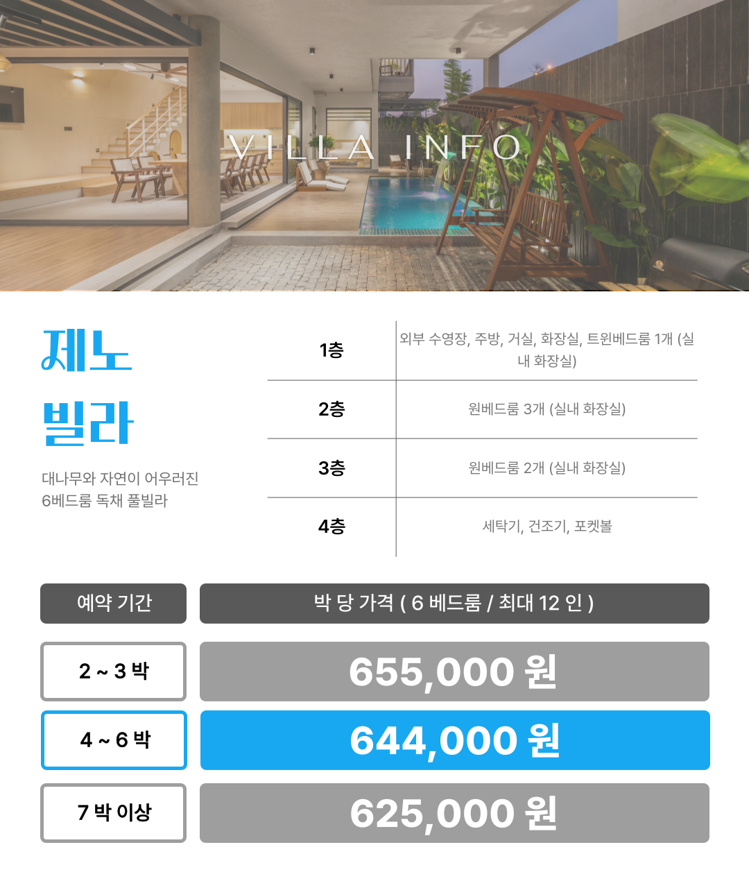 • 빌라 측 사정으로 인해 빌라 요금에 다소 차이가 발생하거나 예약이 불가능할 수도 있습니다.